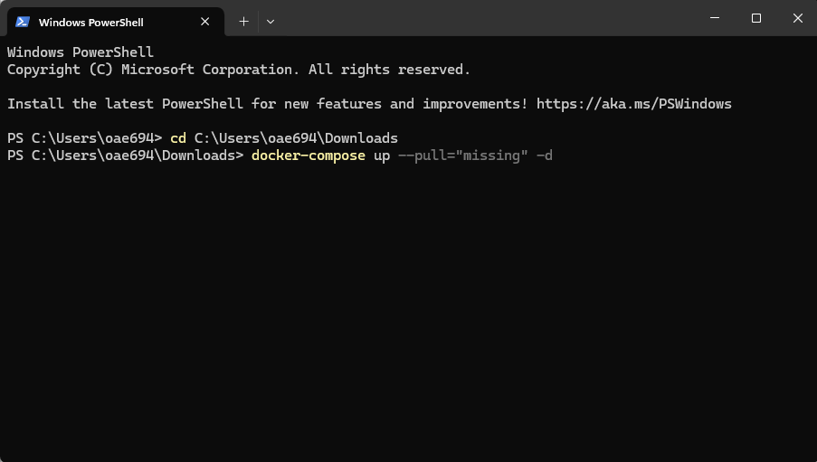 In here, we will: (a) move to the folder where the “docker-compose.yml” is, and (b) run the “docker-compose.yml” file.