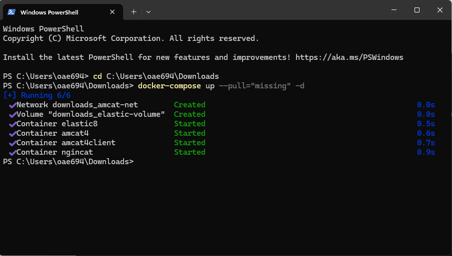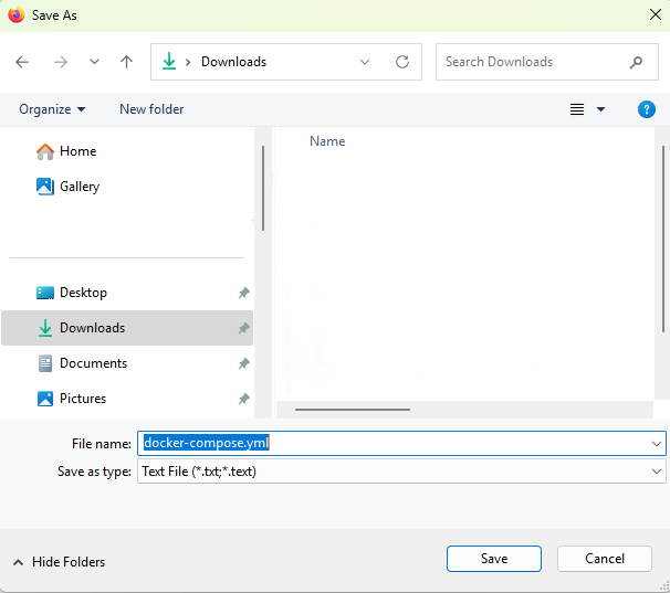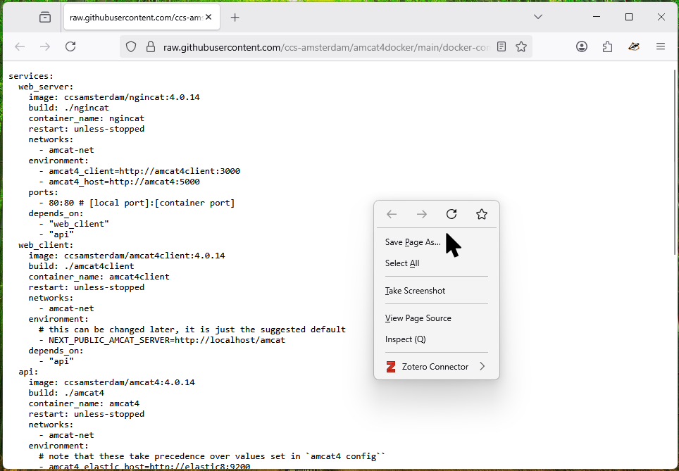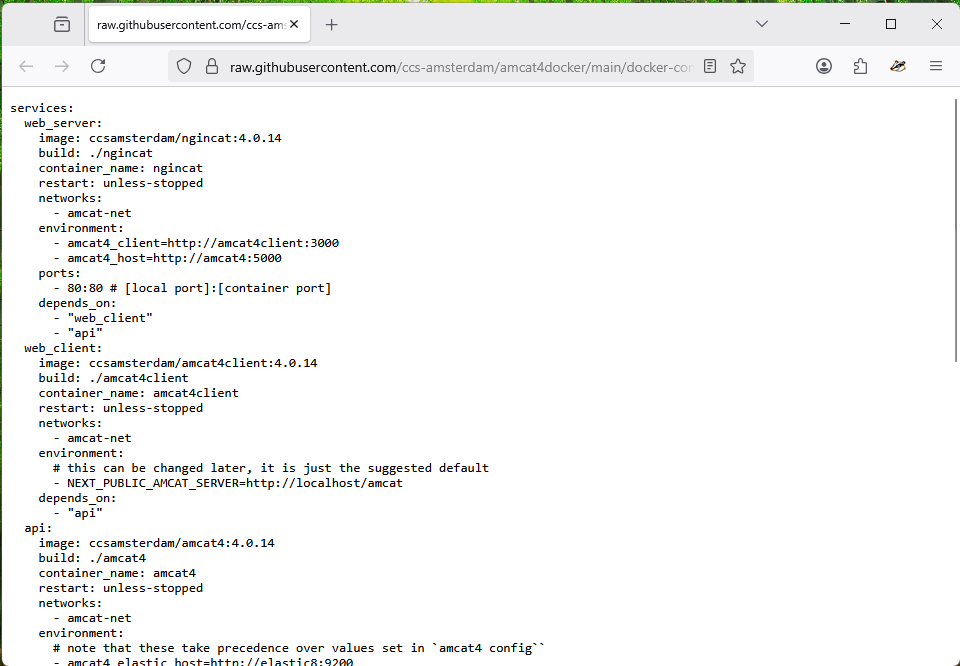 In general, Gruber (2024) explains how to copy a “docker-compose.yml” file depending on the Operating System (OS). Here, we visually follow the steps for the AmCAT “docker-compose.yml” using a Windows OS. Access the AmCAT “docker-compose.yml” here: https://raw.githubusercontent.com/ccs-amsterdam/amcat4docker/main/docker-compose.yml.