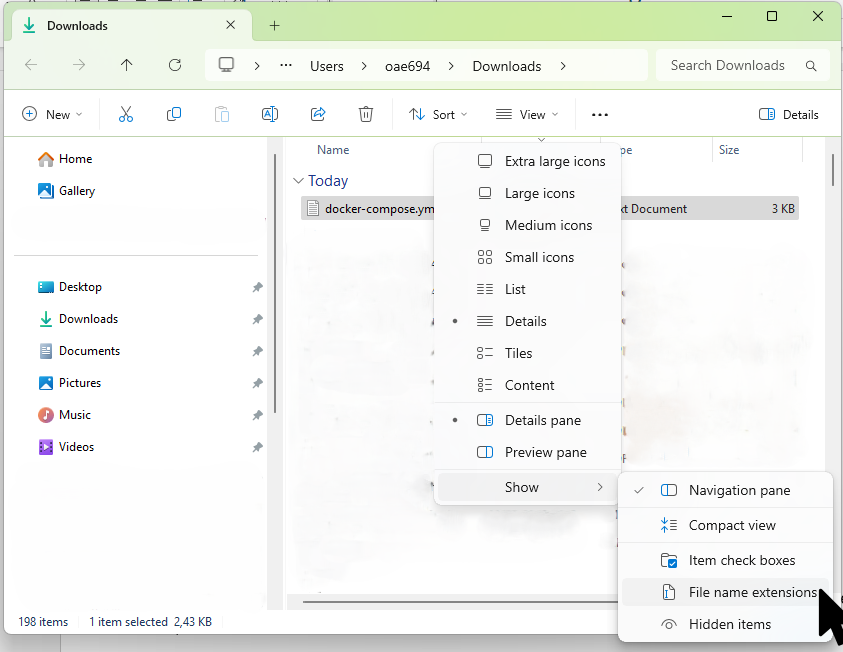 So, we need to explicitly tell Windows that our file is a “yml” type. To do so, you need to press View/Show/File name extensions: