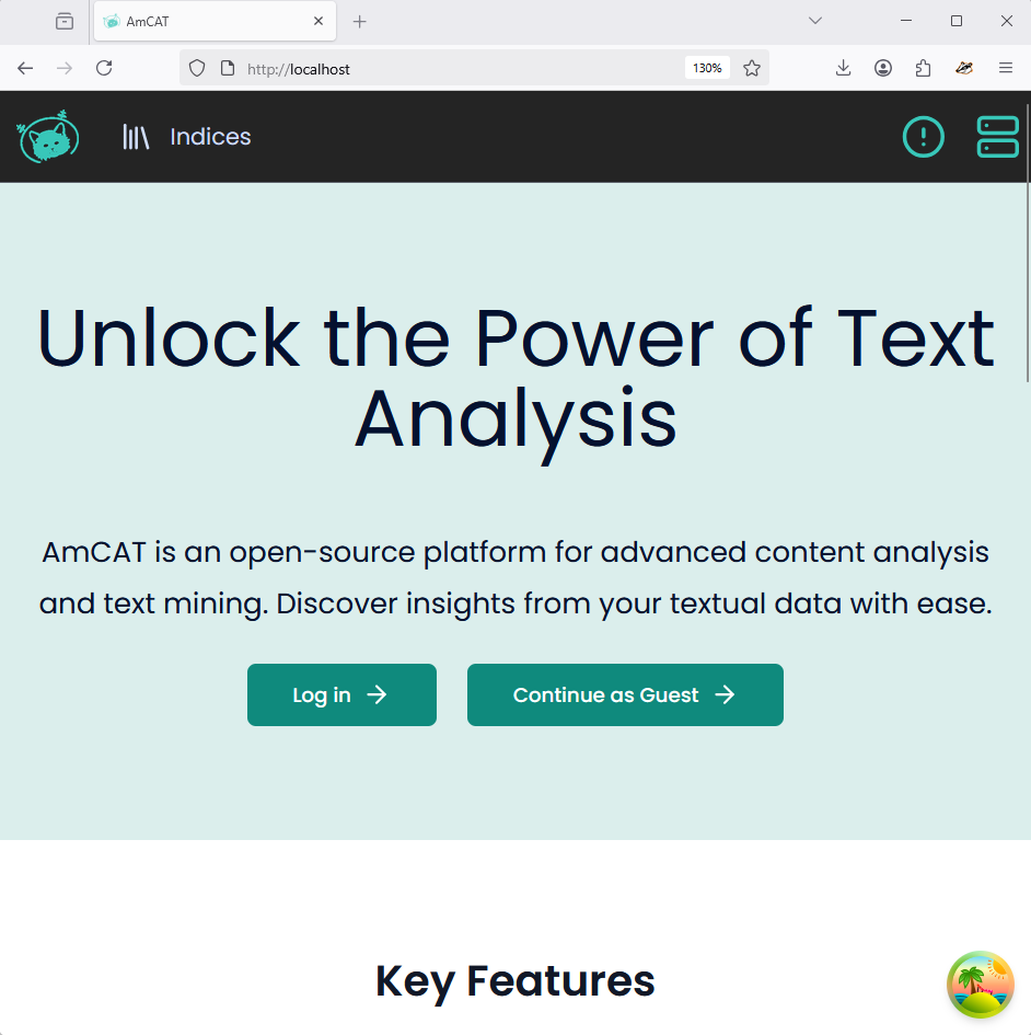 If everything works, you can now access the client at http://localhost:5000, or the address of your server, if you installed AmCAT remotely: